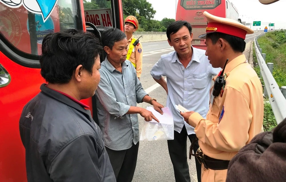 CSGT kiểm tra một xe khách nhưng không phát hiện vi phạm. Ảnh: HẢI HIẾU