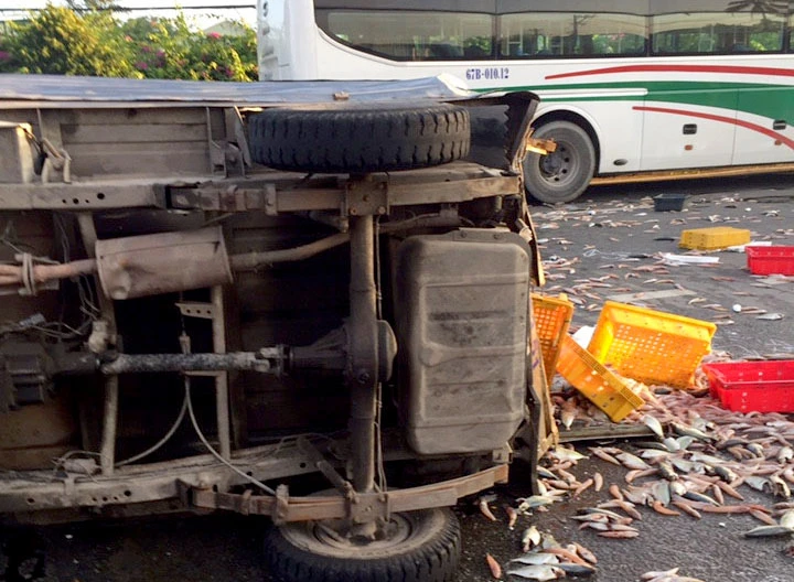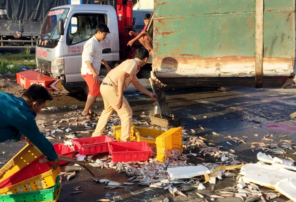 Do xe tải chở cá nên khi xảy ra va chạm, toàn bộ số cá rơi vãi ra khắp mặt đường.