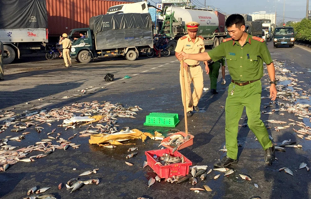 Nhận được tin báo, Đội CSGT quận 12 đã nhanh chóng có mặt để phối hợp khám nghiệm hiện trường cũng như điều tiết giao thông, tránh tình trạng ùn tắc. Do xe tải chở rất nhiều cá, gặp nạn nên rơi vãi ra khắp mặt đường, lực lượng CSGT đã cùng người dân quét, thu gom số cá giúp chủ xe.