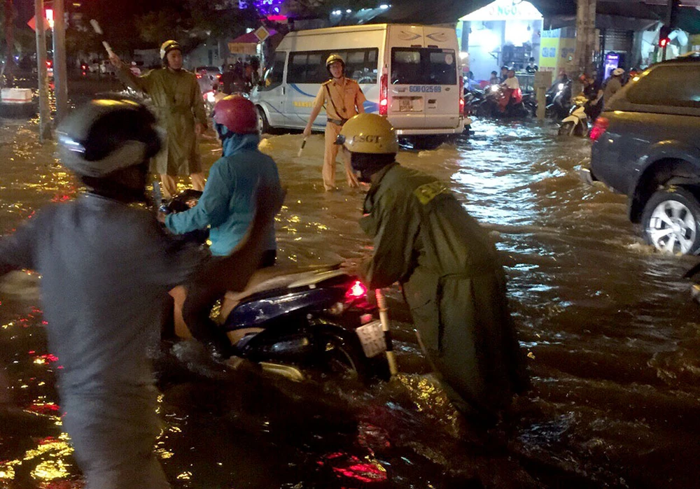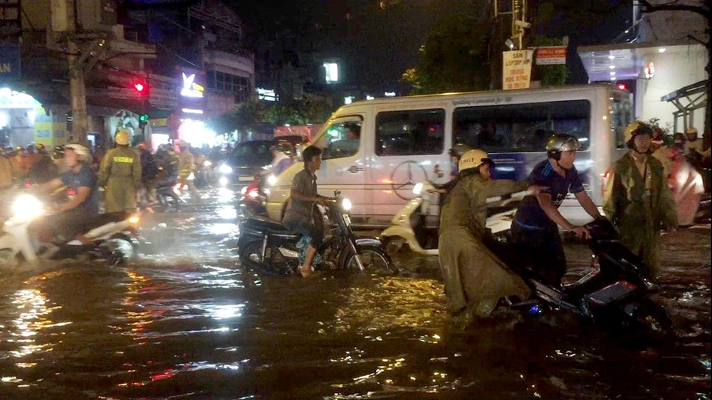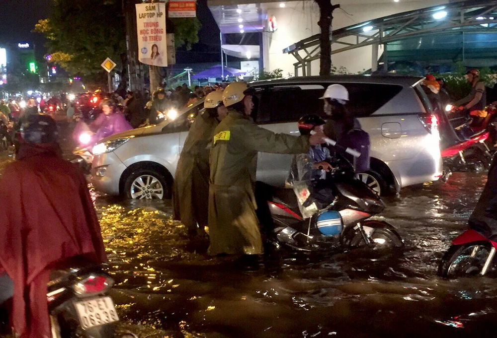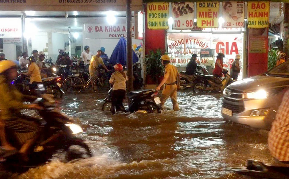 Đội CSGT quận 12 cho biết, từ chiều đến giờ, nước ngập tại khu vực trên không kịp rút; mực nước lên đến hơn nửa bánh xe. Đến giờ cao điểm, xe cộ đổ về đây, gây ùn ứ nghiêm trọng.