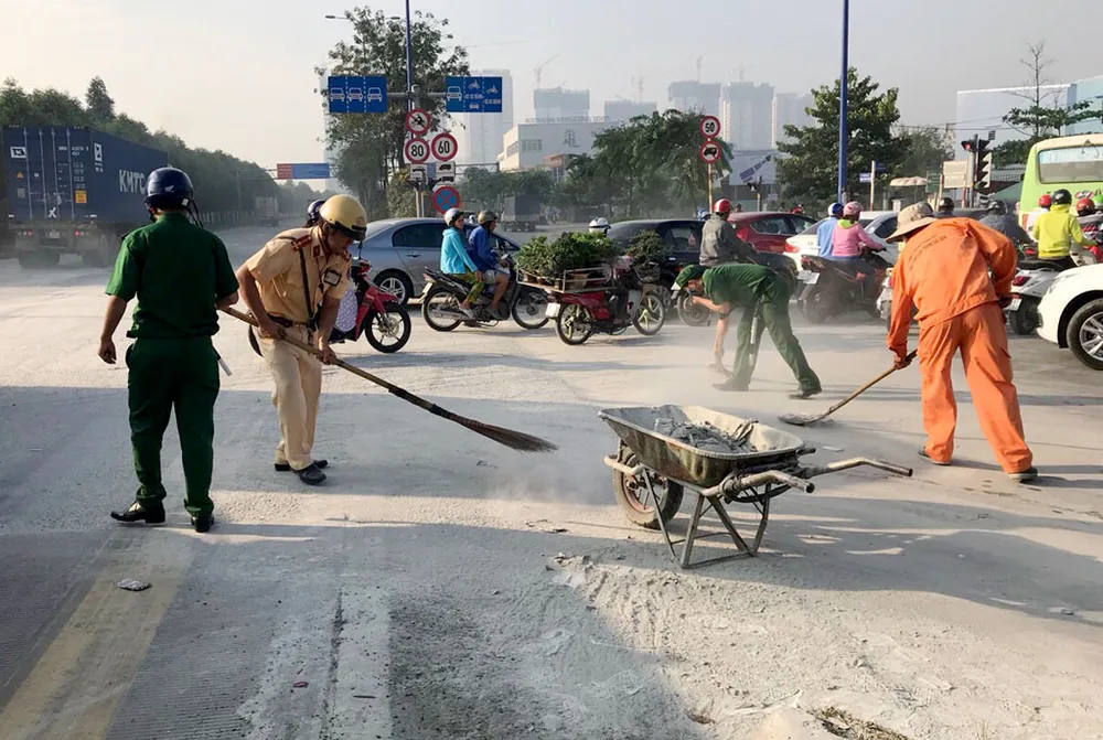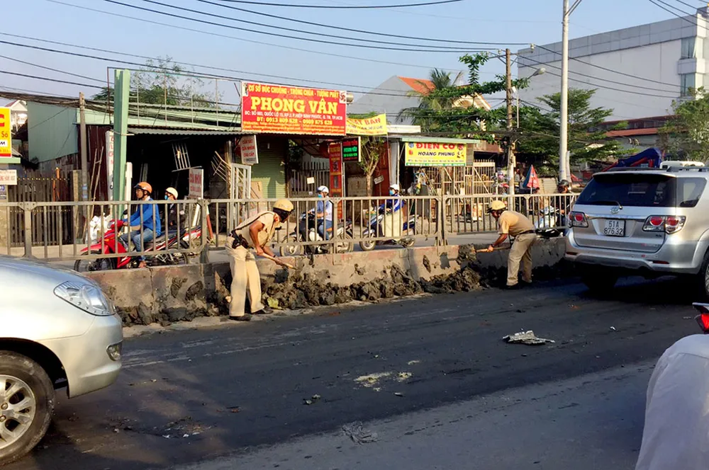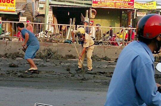 Lúc này, lượng người tham gia giao thông đang khá đông nên số đất bùn rơi vãi có thể gây cản trở giao thông, làm đường trơn trượt, dễ gây té ngã. Nhận biết điều này, Đội CSGT Bình Triệu đã phân công lực lượng tích cực dọn đất bùn rơi vãi. Một số người dân và công ty vệ sinh môi trường cũng đã đến hỗ trợ CSGT để việc dọn dẹp nhanh chóng hoàn thành.