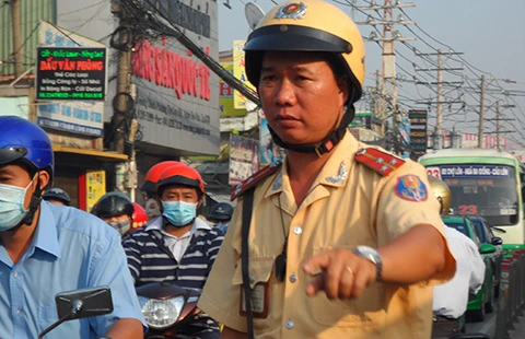 CSGT đang làm nhiệm vụ tại ngã ba Tân Sơn Nhì - Trường Chinh vào giờ cao điểm. Ảnh: NGUYỄN TRÀ
