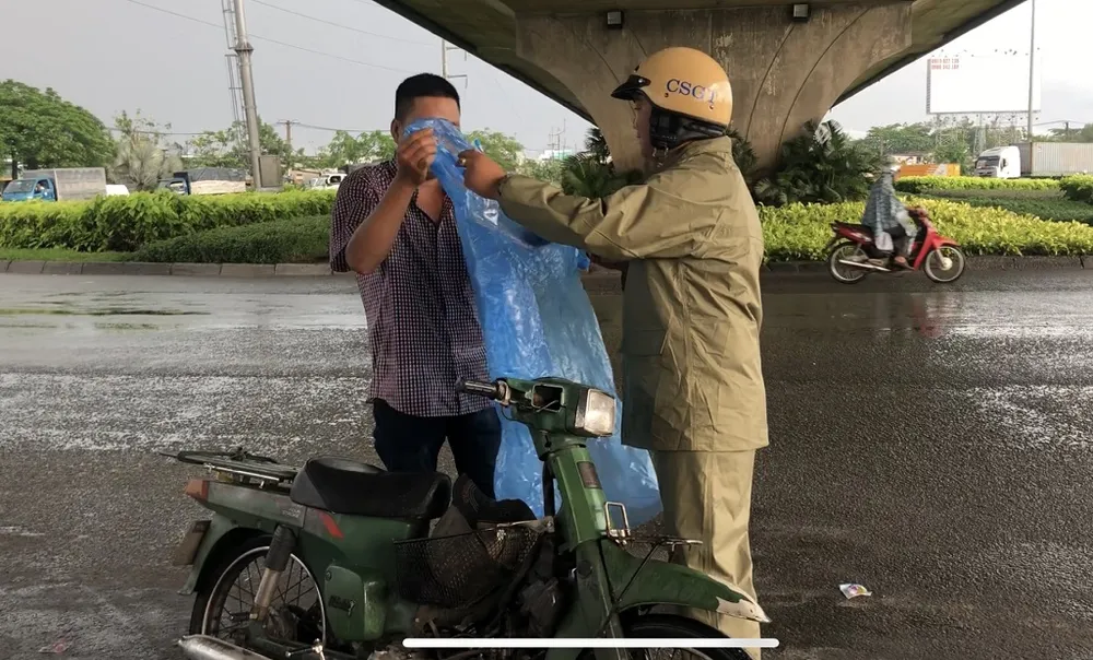 Do mưa lớn đột ngột trút xuống, nhận thấy nhiều người dân không chuẩn bị sẵn áo mưa nên bị ướt nên cảnh sát làm thêm nhiệm vụ "đột xuất". Theo đó, tại khu vực vòng xoay Nguyễn Văn Linh (huyện Bình Chánh), Đội CSGT Tân Túc liên tục phát tặng áo mưa cho người dân, giúp bà con tiếp tục tham gia giao thông.