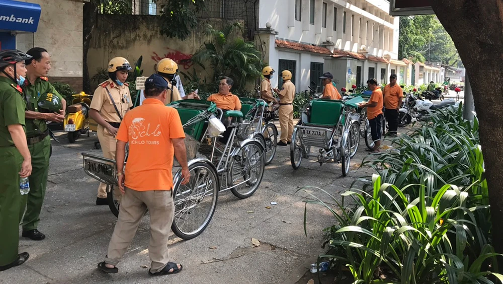 Trước đó, Công an quận 1 xử lý nhiều xích lô "dù" hoạt động chèo kéo, làm giá khách du lịch trên địa bàn. Ảnh: CA