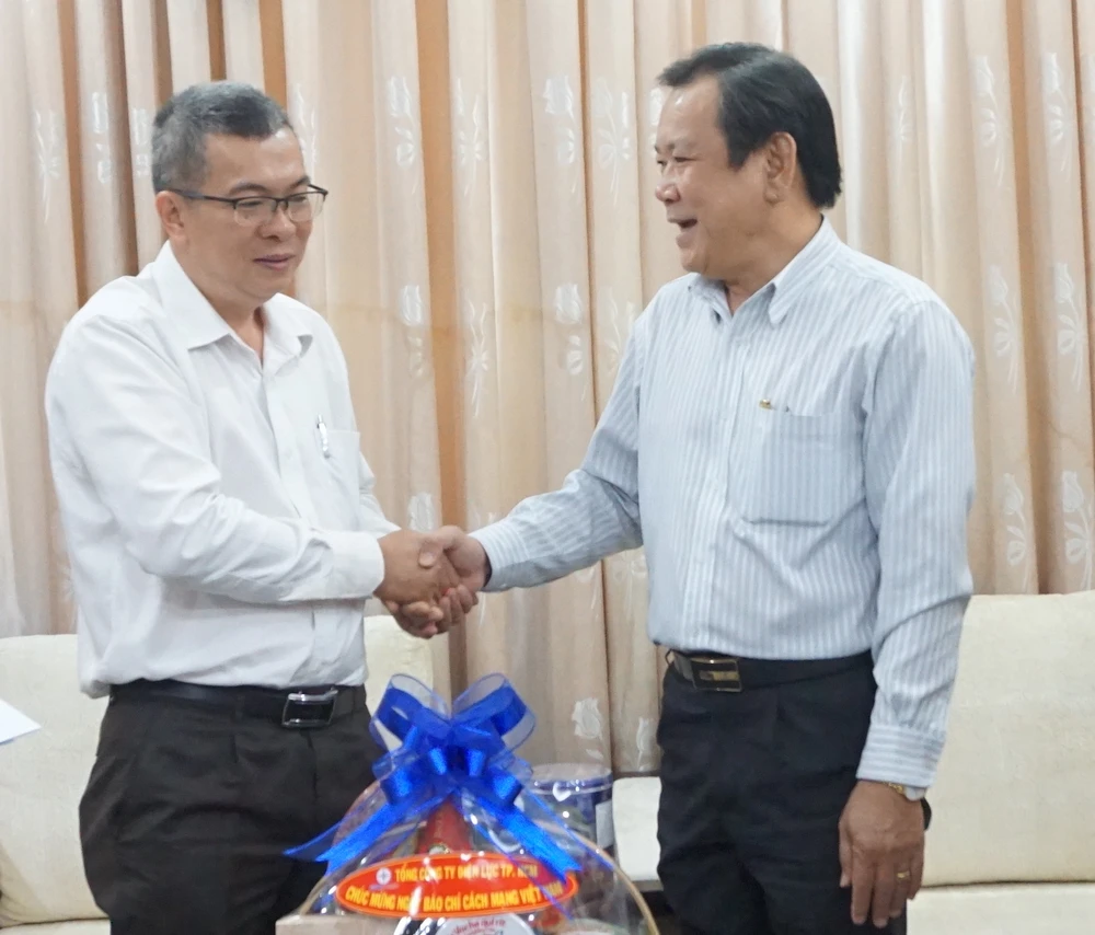 Phó tổng giám đốc Tổng công ty Điện lực TP.HCM Nguyễn Văn Thanh (trái) chúc mừng Báo Pháp Luật TP.HCM. Ảnh: NGÂN NGA