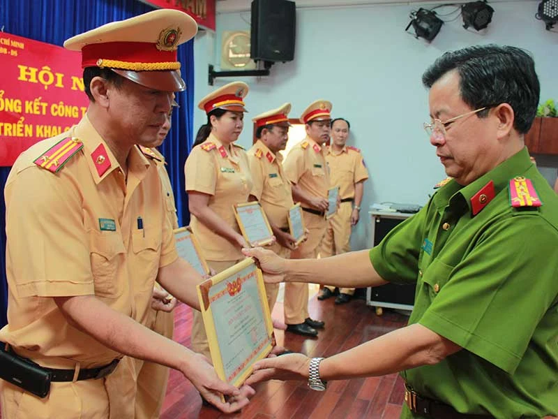 Đại tá Trần Đức Tài, Phó Giám đốc Công an TP.HCM, trao bằng khen của Công an TP cho các cá nhân, tập thể có thành tích xuất sắc trong công tác năm 2017. Ảnh: LÊ THOA