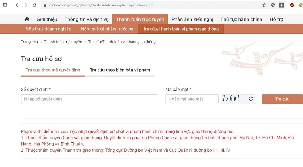 Trên Cổng dịch vụ công quốc gia, người dân có thể tra cứu quyết định xử phạt vi phạm hành chính của mình, mức phạt tiền. Sau đó, có thể tiến hành việc nộp tiền phạt trực tuyến, đăng ký dịch vụ chuyển giấy tờ bị cơ quan công an tạm giữ tại nhà qua bưu điện hoặc người dân trực tiếp đến cơ quan công an để thực hiện quyết định xử phạt.
