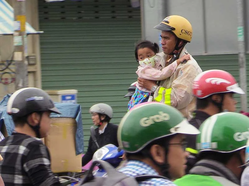 CSGT TP.HCM bồng bé gái qua khỏi điểm ngập ở vòng xoay An Lạc sau bão số 9. (Ảnh chụp tháng 11-2018). Ảnh: L.THOA