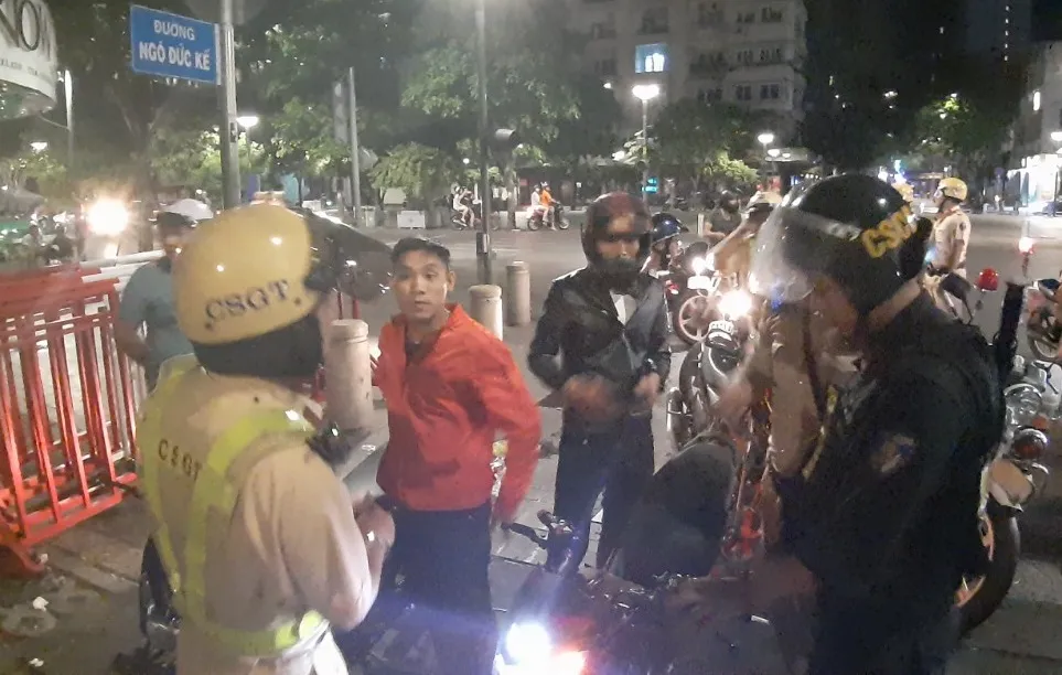 Đội CSGT Bến Thành đã kiểm tra hành chính, xử lý các nhóm thanh niên tụ tập thành đoàn. Ảnh: LINH THOA