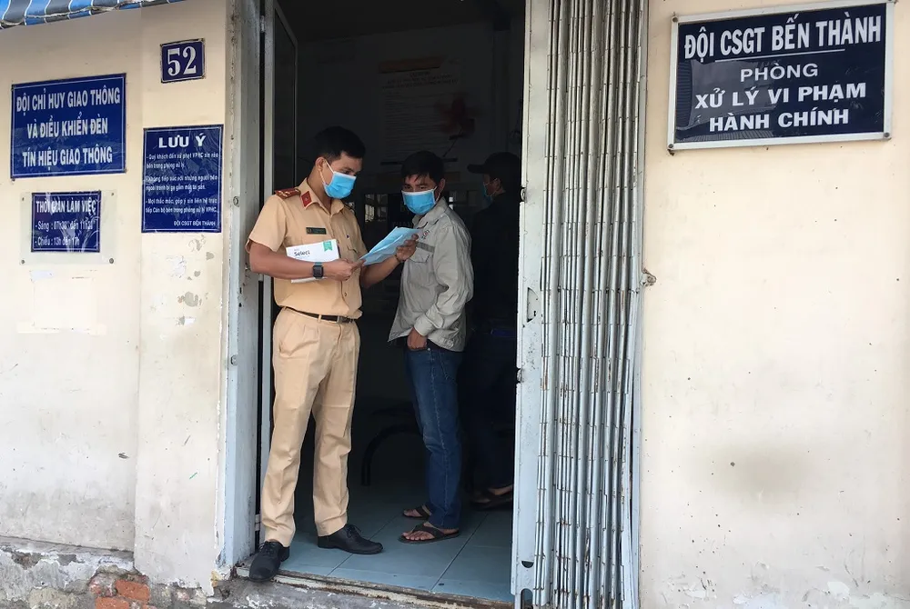 CSGT Bến Thành và người dân tại phòng xử lý vi phạm đều đeo khẩu trang khi làm việc. Ảnh: M.VƯƠNG