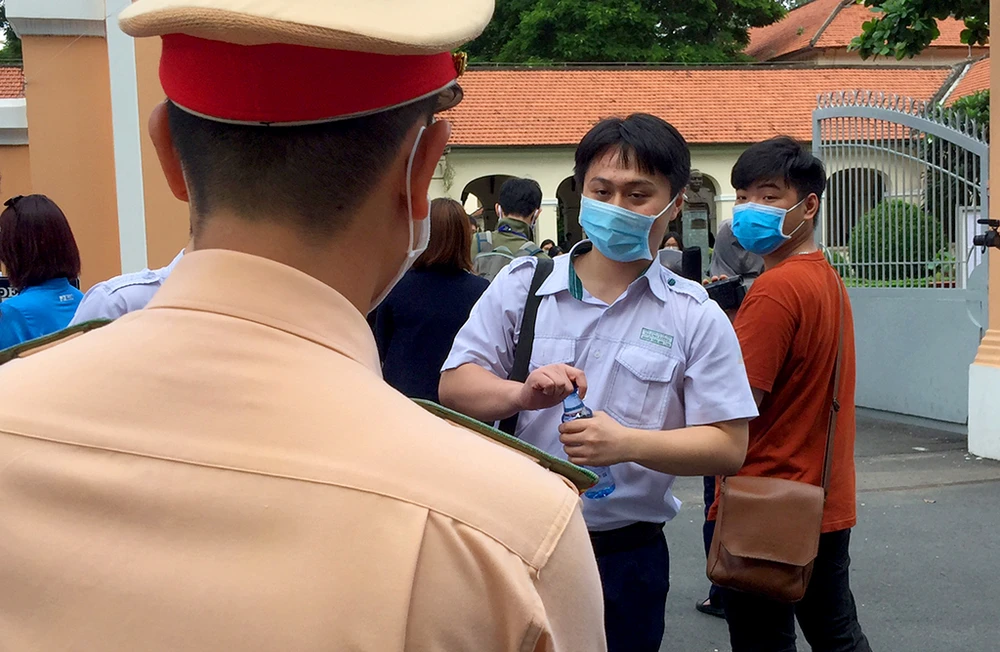 Nhiều sĩ tử ở điểm thi THPT chuyên Lê Hồng Phong, quận 5 nhận nước suối của CSGT Bến Thành. Ảnh: HK