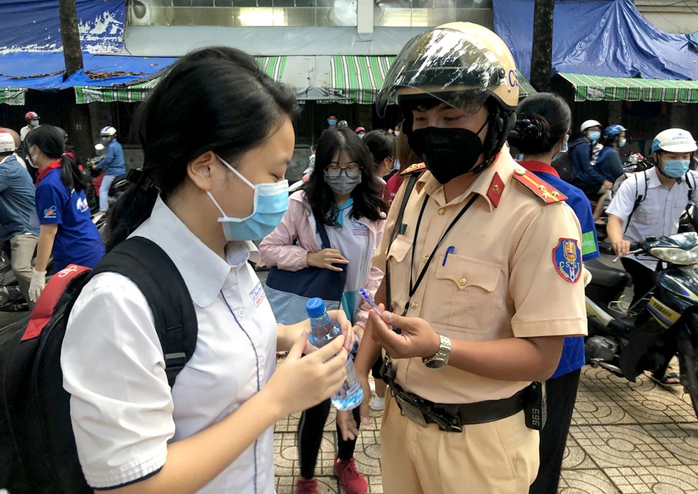 Đặc biệt, các tổ CSGT cũng tổ chức tặng khẩu trang và nước suối miễn phí cho các em học sinh trước và sau khi bước ra khỏi phòng khi, tạo sự cổ vũ tinh thần cho các em thi tốt trong thời điểm có dịch COVID-19.