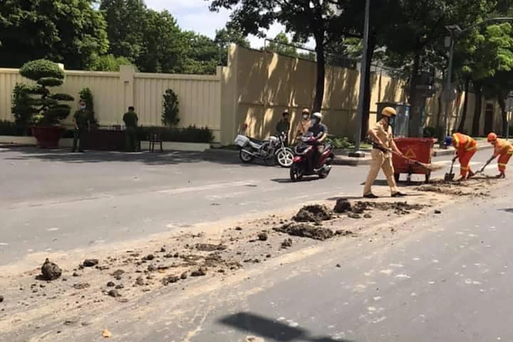 Lực lượng CSGT-TT sau đó đã đến hiện trường phối hợp với nhân viên công ích dọn dẹp, đồng thời trích xuất hình ảnh từ các camera an ninh khu vực để truy tìm phương tiện gây rơi vãi bùn đất.