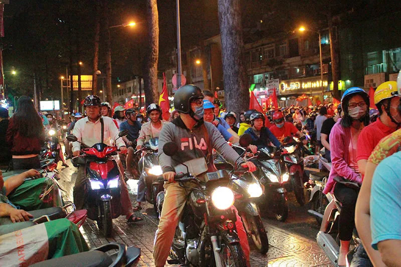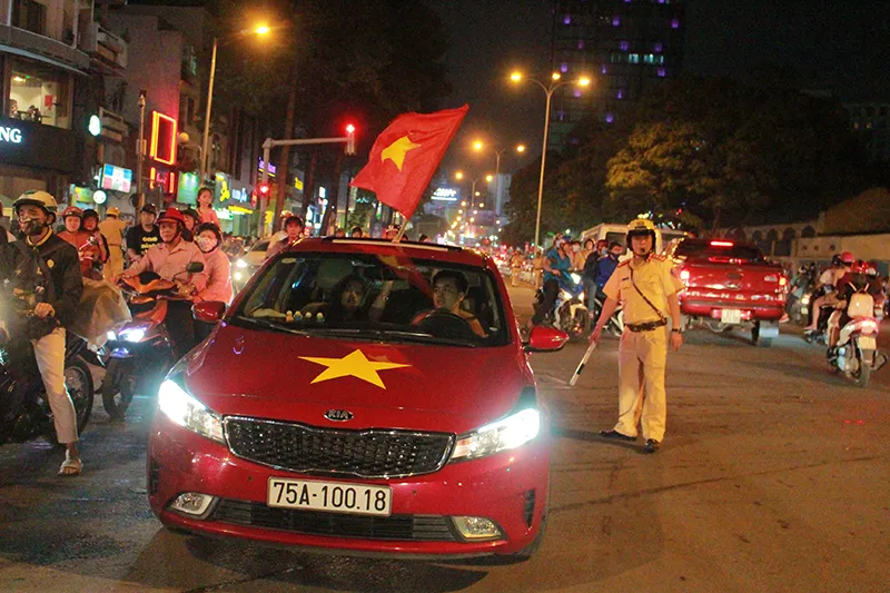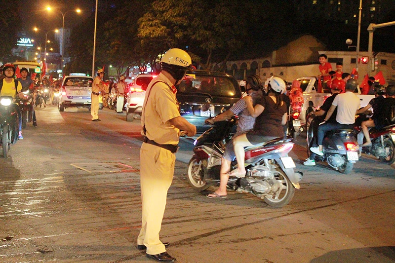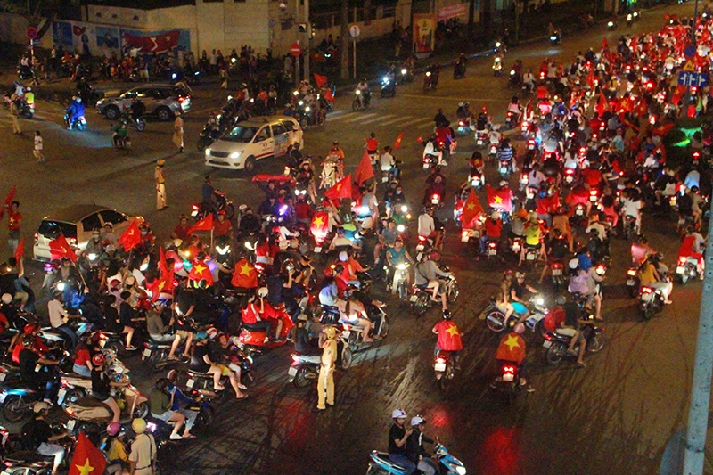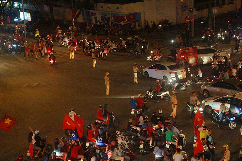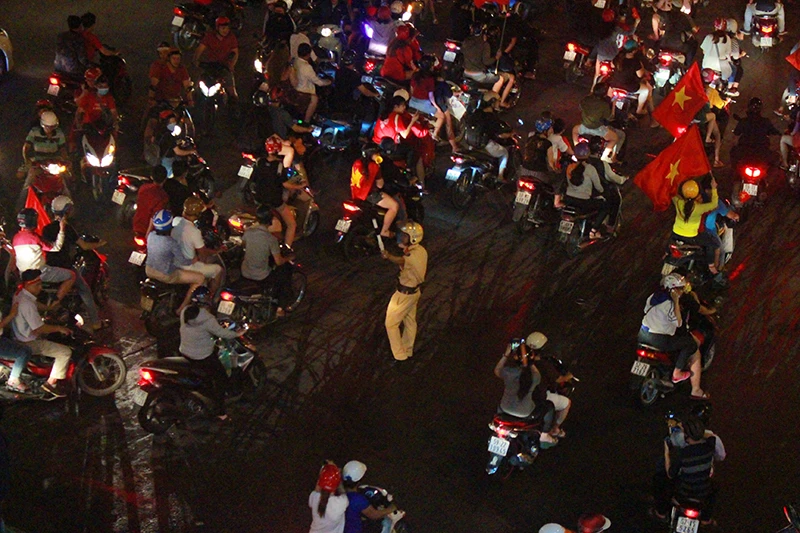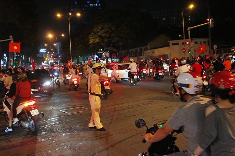 May có CSGT phân luồng nên giao thông đỡ hỗn tạp vì có nhiều thanh niên phấn khích ngang nhiên chắn ngang ngã tư hoặc dừng lại để hú hét.