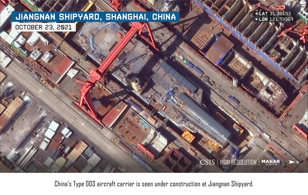 Tiến độ đóng tàu sân bay thứ ba của Trung Quốc vẫn tiếp diễn trong suốt năm 2021 và con tàu - thường được gọi là Type 003 - có thể hạ thủy trong những tháng tới, Trung tâm Nghiên cứu chiến lược và quốc tế (CSIS - Mỹ) ngày 9-11 nhận định.