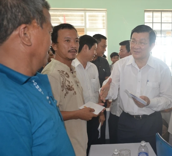 Ghi nhận các kiến nghị, phản ánh của ngư dân, Chủ tịch nước Trương Tấn Sang cho hay, những ngày này, cả nước đang dồn sự quan tâm và lo lắng về vùng biển miền Trung. Ngư trường bị thu hẹp, việc làm ăn của ngư dân ta đang gặp khó khăn do sự mất ổn định trên vùng biển. Trong tình hình phức tạp như vậy, nhưng bà con vẫn kiên cường bám biển cùng bảo vệ chủ quyền biển đảo. Thời gian tới, lực lượng kiểm ngư và cảnh sát biển cũng sẽ được tăng cường để góp sức nhiều hơn giúp ngư dân bám biển.
