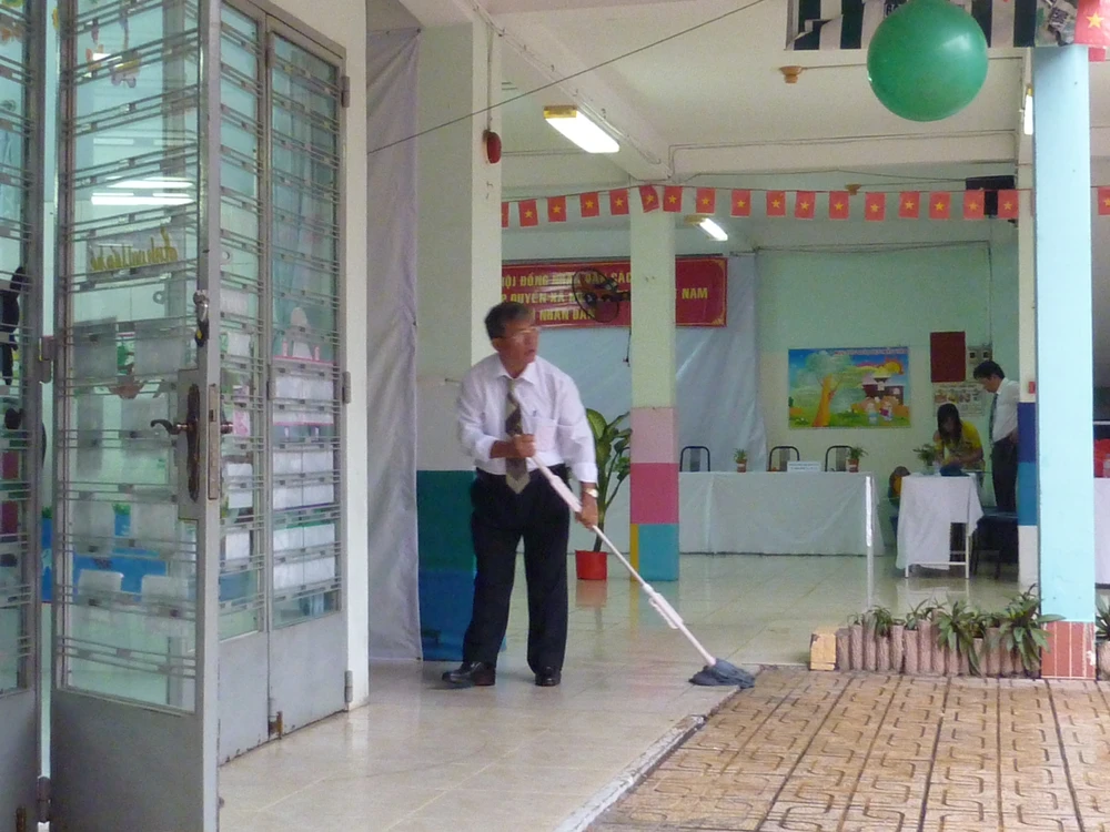 Cán bộ trong tổ công tác bầu cử lau lại sàn nhà để đón cử tri đến. ẢNH: THANH TUYỀN