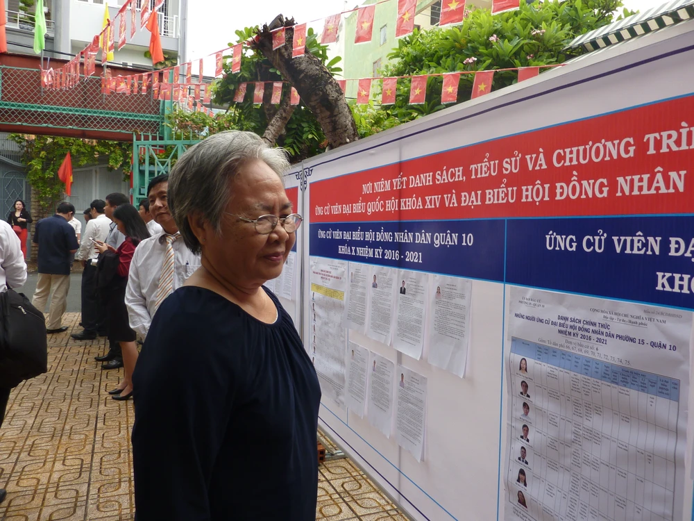Bà Đỗ Thị Thoi (75 tuổi) đang xem lại danh sách các ứng cử viên tại khu vực bầu cử số 97. ẢNH: THANH TUYỀN