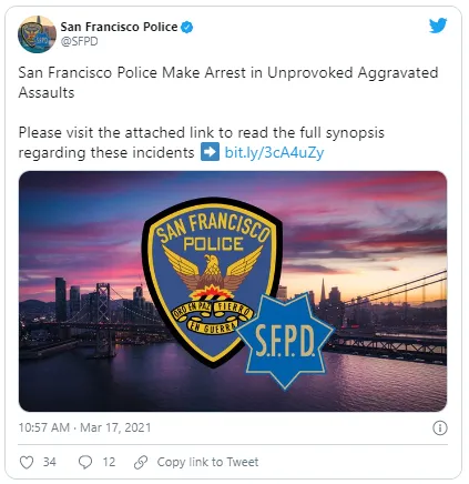 Giống như các thành phố khác trên khắp nước Mỹ, San Francisco đang phải vật lộn với làn sóng bạo lực nhắm vào người Mỹ gốc Á. Hôm 26-3, sở cảnh sát thành phố báo cáo đã bắt giữ một nghi phạm 32 tuổi trong hai vụ tấn công vô cớ xảy ra trước đó một ngày.