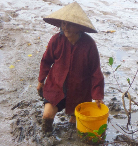 Bà Sáu Dẫu bắt cá trên bãi sông Vàm Cỏ. Ảnh: H.THU