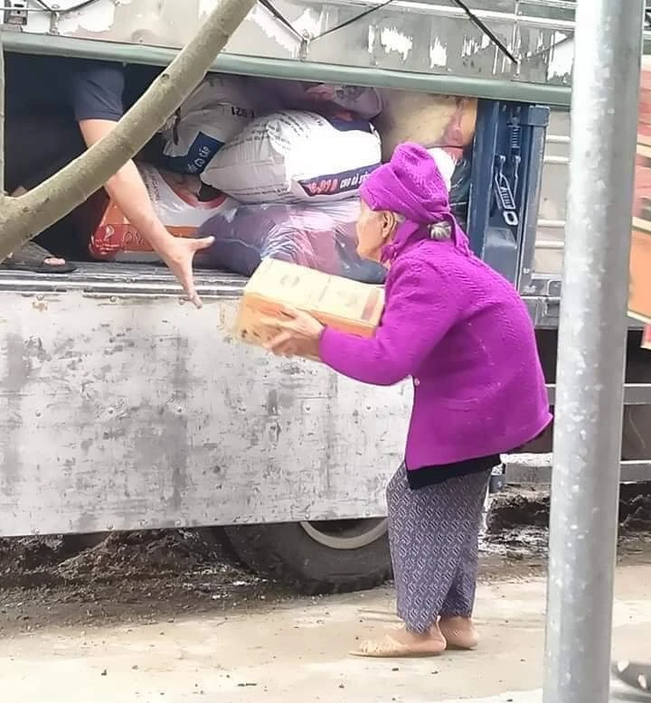 Khi cụ thấy xe tải chở hàng từ thiện, cụ liền ôm thùng mì tôm ra ủng hộ nói: "Bà có thùng mì ni thôi, nhờ các chú gửi vào cho đồng bào lũ lụt".