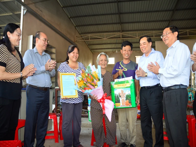 Lãnh đạo Tỉnh ủy Bến Tre trao thư khen bà Hưỡn đã có nghĩa cử đẹp chia sẻ nước ngọt đến người dân.