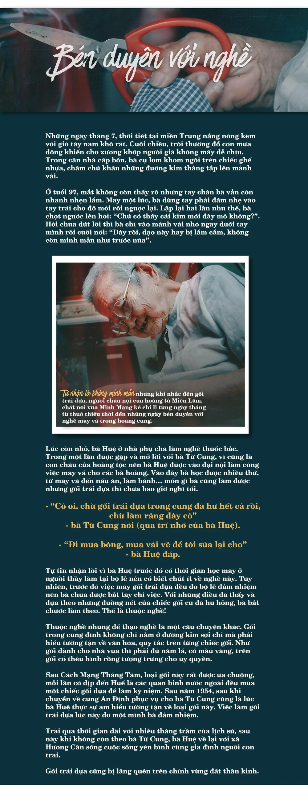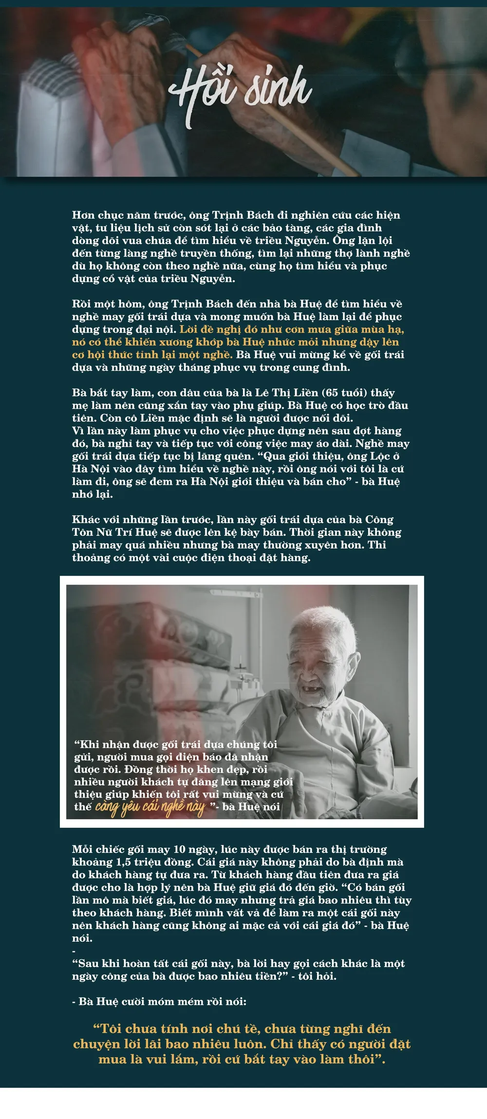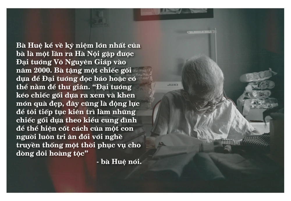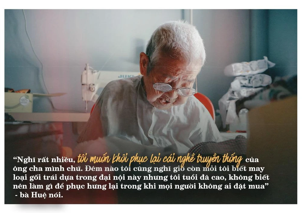 - “Nghĩ rất nhiều, tôi muốn khôi phục lại cái nghề truyền thống của ông cha mình chứ. Đêm nào tôi cũng nghĩ giờ còn mỗi tôi biết may loại gối trái dựa trong đại nội này nhưng tôi tuổi đã cao, không biết nên làm gì để phục hưng lại trong khi mọi người không ai đặt mua” - bà Huệ nói.