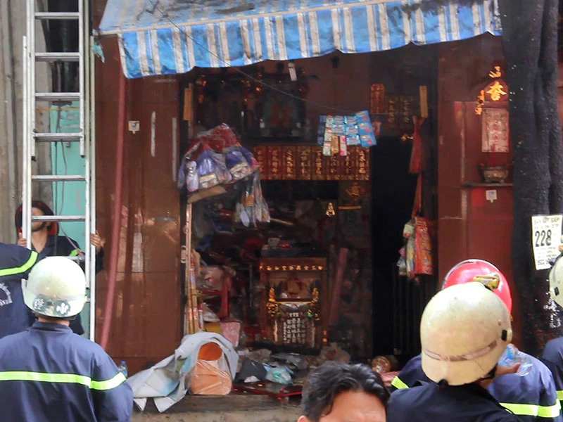 Chiều 19-6, nhiều người dân sống cạnh tiệm bán vàng mã, nhang trên đường Tôn Thất Hiệp (phường 12, quận 11) phát hiện khói lửa bùng phát dữ dội từ tầng 1 của căn nhà nên hô hoán.