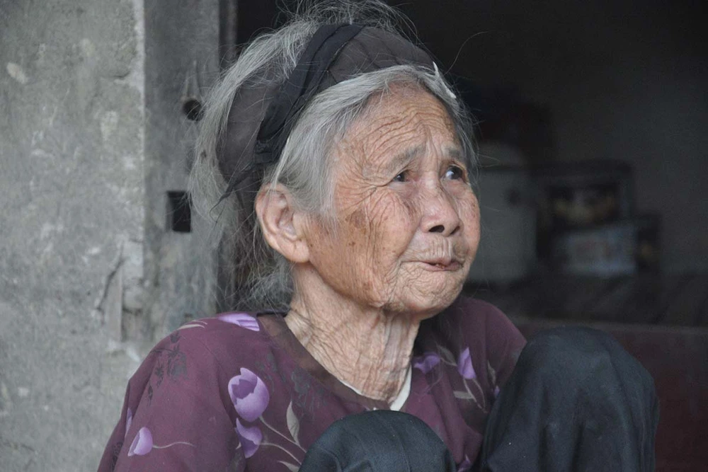 Hình ảnh bà Thước hiện ra trước mắt chúng tôi với mái tóc bạc, đôi bàn tay chai sần, đôi chân trần ngồi lọt thỏm giữa căn nhà xuống cấp khiến nhiều người đi cùng thương cảm một cuộc đời vất vả không chồng, không con, sống đơn độc.