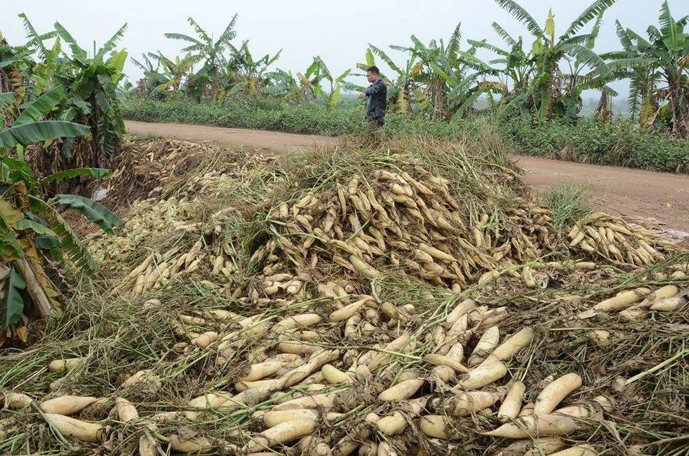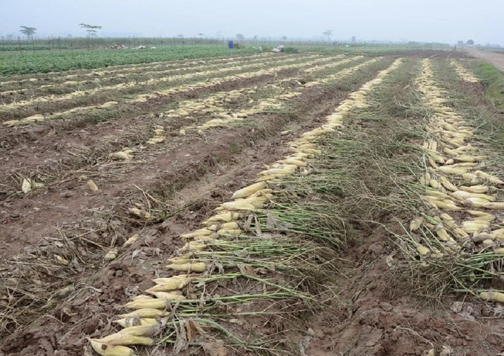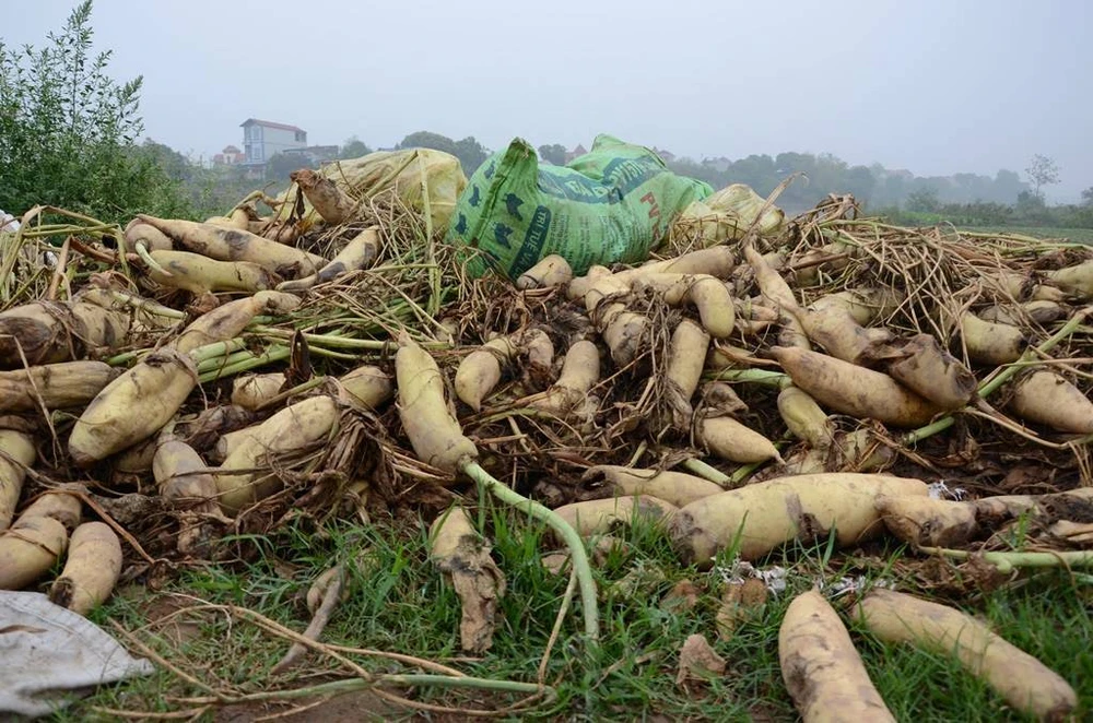 Tại xã Tráng Việt, có những hộ phải đổ bỏ hàng chục tấn củ cải. Thậm chí những hộ trồng với diện tích lớn còn phải bỏ chi phí thuê người dọn ruộng và chở củ cả mang đi vứt.