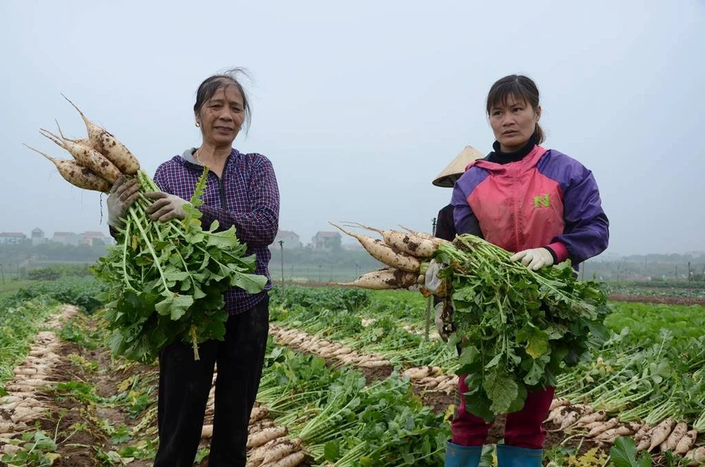 Chị Nguyễn Thị Tuyết (áo đỏ, trú thôn Đông Cao, xã Tráng Việt), thương lái thu mua củ cải, cho biết do vượt mức tiêu thụ quá nhiều, hiện người dân có muốn bán cũng không ai mua, không tiêu thụ được. “Gia đình chị thu mua củ cải của người dân từ lúc nhỏ với giá từ 1,5 triệu đến 2 triệu/sào. Tuy nhiên, do không bán được, chị phải nhổ bỏ và vứt đi khoảng 20 tấn củ cải.