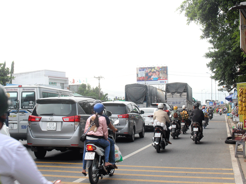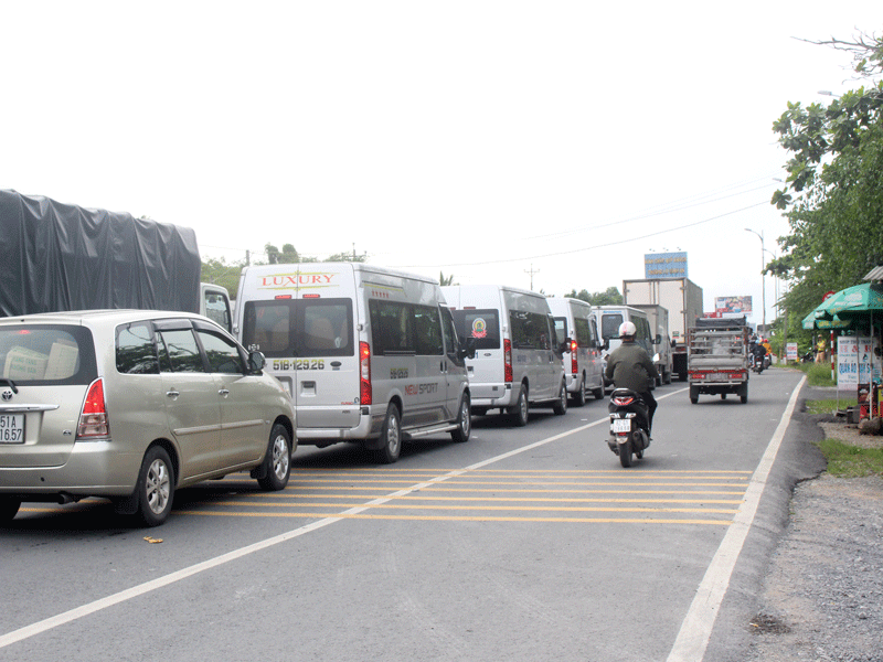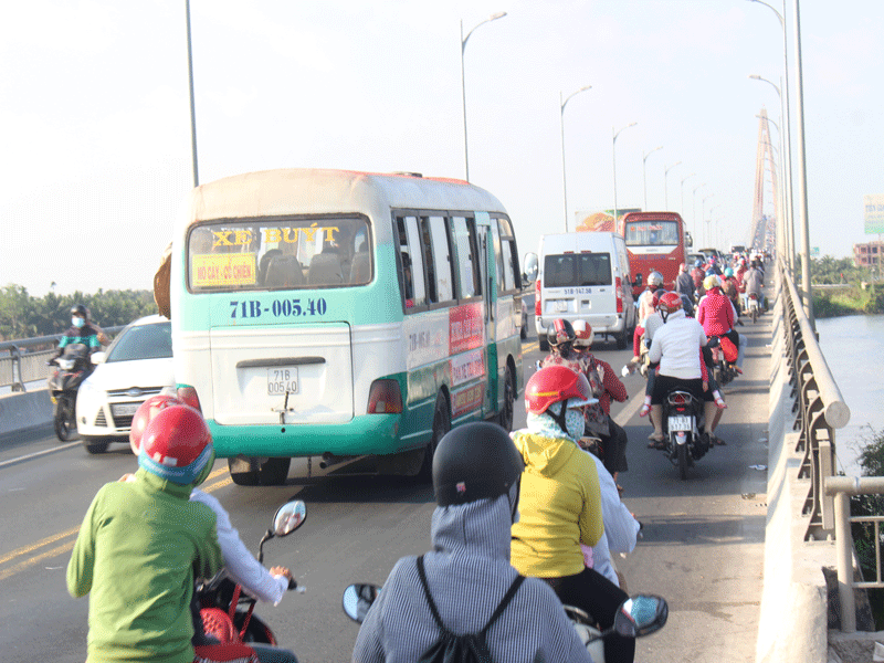 Dòng xe xếp hàng dài trên QL60 để lên cầu Rạch Miễu.