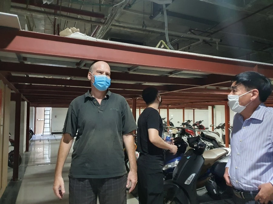 Một cư dân đứng đụng trần nhà để xe thông minh. Ảnh: TẤN VIỆT
