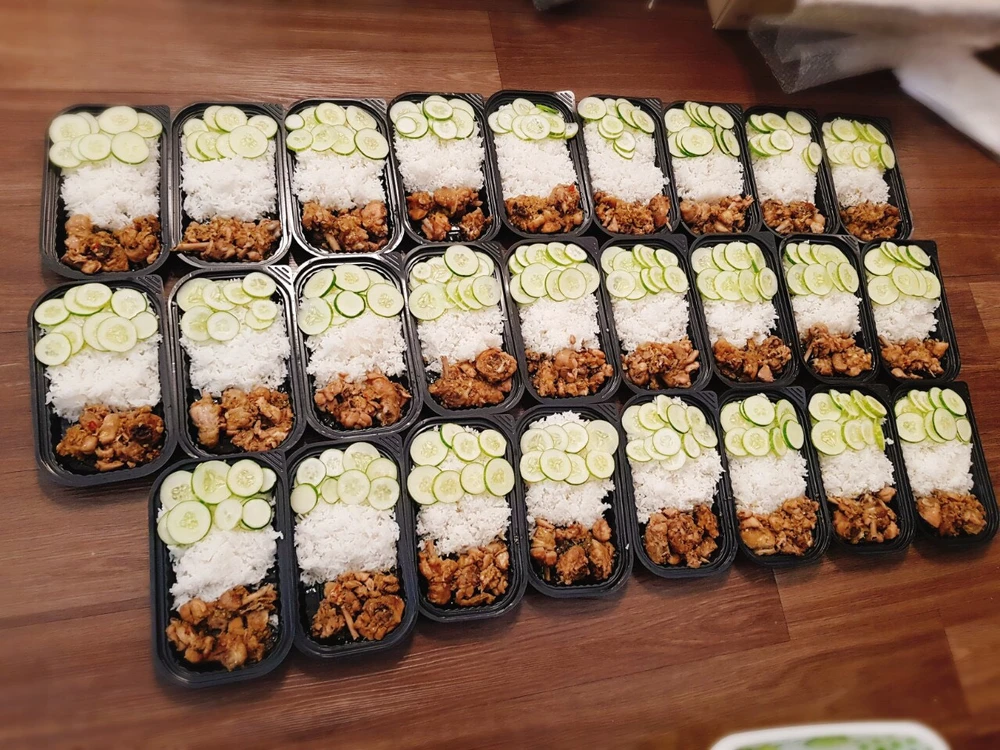 Những suất cơm được xếp ngay ngắn gửi tặng các lực lượng tuyến đầu. Ảnh: NVCC