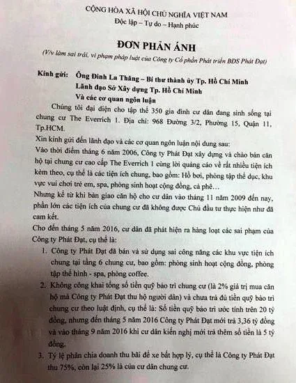 Đơn phản ánh của cư dân The Everrich I gửi Bí thư Thành ủy TP.HCM Đinh La Thăng