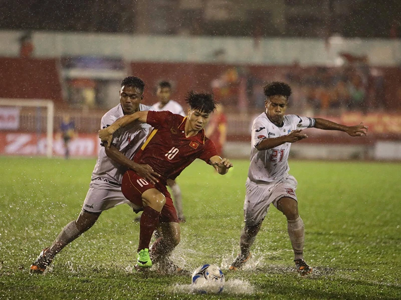 Công Phượng trong sự đeo bám của U-23 Đông Timor.