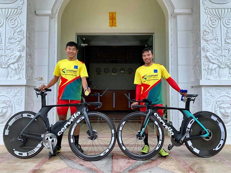 Tân vô địch CNTG 40 km Nguyễn Tuấn Vũ (trái) và HCB Nguyễn Trường Tài bên hai chiếc xe chuyên dụng mua “chịu”. Ảnh: QUANG MINH