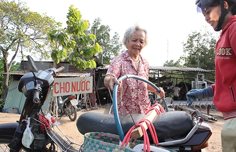 | Chung tay với bà già cho nước… Thông tin bà già đổi nước miễn phí mấy ngày qua nhận được nhiều chia sẻ của cộng đồng mạng. Cảm phục tấm lòng của bà Bảy, mới đây một mạnh thường quân tại TP Bến Tre đã tiếp sức cho gia đình bà Bảy hai bồn chứa nước mỗi bồn một khối nước. Anh Phước, con trai bà Hưởn, nói: “Từ khi có hai cái bồn nước lớn, mẹ mừng lắm. Trước đó, thấy mấy em cháu sống nhà trọ không có đồ chứa nước nhiều, có hôm bơm nước không kịp, bà rất xót. Bà dặn tui làm cái chân sắt để hai bồn nước lên, rồi tối chịu khó thức bơm đầy nước, xử lý sơ để nước lắng hết cặn, để bà con đến là có ngay nước sạch xài, khỏi chờ đợi mất công. Dù công việc làm cửa sắt của tui nhiều khách hàng nhưng mỗi lần thấy bà cười khi nhìn người xin nước vui tui cũng ráng thêm chút xíu”.