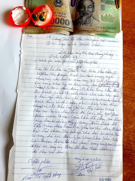 “Tôi được con cháu cho tiền, tôi tiết kiệm để dành được 1,5 chỉ vàng và 3 triệu đồng. Nay tôi xin ủng hộ chút ít để phục vụ dân” - cụ Huê viết.