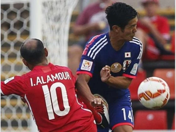 Yoshinori Muto (phải) trong trận Nhật- Palestine ở VCK Asian Cup 2015.