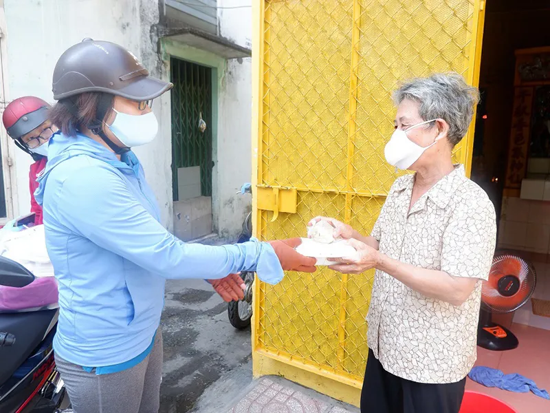 Chị Trần Thụy Trúc Sơn (trái), Chủ tịch Hội Liên hiệp Phụ nữ phường 5, quận Gò Vấp, TP.HCM, trao tận tay phần cơm trưa cho bà Sáu. Ảnh: TRÚC PHƯƠNG