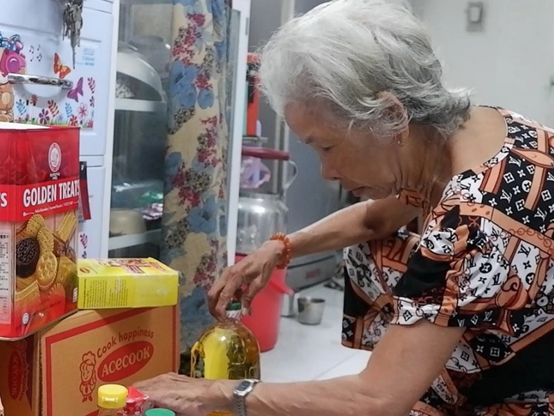 Bà Thiệt cẩn thận cất giữ các nhu yếu phẩm được hỗ trợ. Ảnh: TRÚC PHƯƠNG