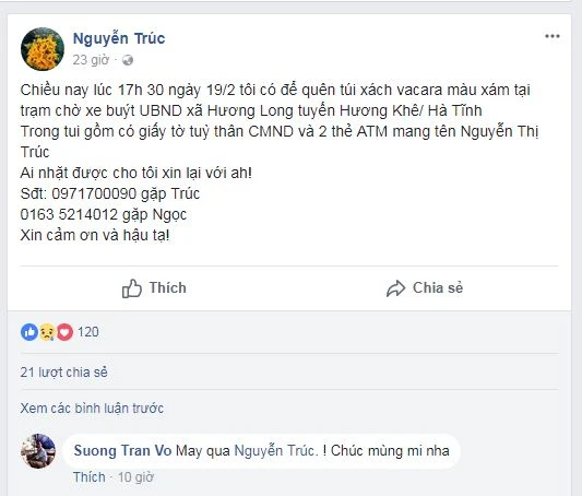 Tôi ra bến xe buýt gần UBND xã Hương Long chờ xe buýt rồi có xe taxi chạy qua tôi lên xe taxi nhưng vì có nhiều hành lý nên quên chiếc túi quan trọng đó. Khi ra đến sân bay Vinh (TP Vinh, Nghệ An) tôi mới phát hiện quên mất chiếc túi đựng giấy tờ cá nhân và một cây vàng, gần 20 triệu đồng và có đăng lên Facebook tìm chiếc túi chỉ với mong muốn xin được giấy tờ cá nhân để kịp đi máy bay.