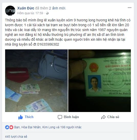 Ông Luyện cho biết: "Lúc đó tôi kiểm tra thấy trong túi nhiều tiền và hai thẻ nhựa ATM và giấy CMND mang tên Nguyễn Thị Trúc (31 tuổi, nguyên quán Nghệ An, trú phường Dĩ An, thị xã Dĩ An, Bình Dương), chiếc vé máy bay. Tôi nghĩ đây là tiền mồ hôi nước mắt của họ và họ cần lên tàu bay gấp, liền mang chiếc túi đó đi trình báo xóm trưởng và công an rồi bảo con trai là Lê Xuân Đức chụp ảnh chiếc túi và giấy CMND đăng lên mạng để mong sớm tìm người mất trả lại cho họ để họ kịp bay vào TP.HCM.