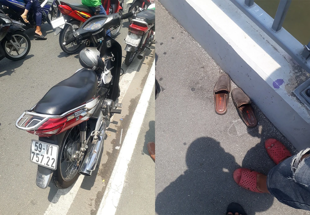 Xe máy và đôi dép ông T. để lại trên cầu Sài Gòn. Ảnh: NGUYỄN YÊN