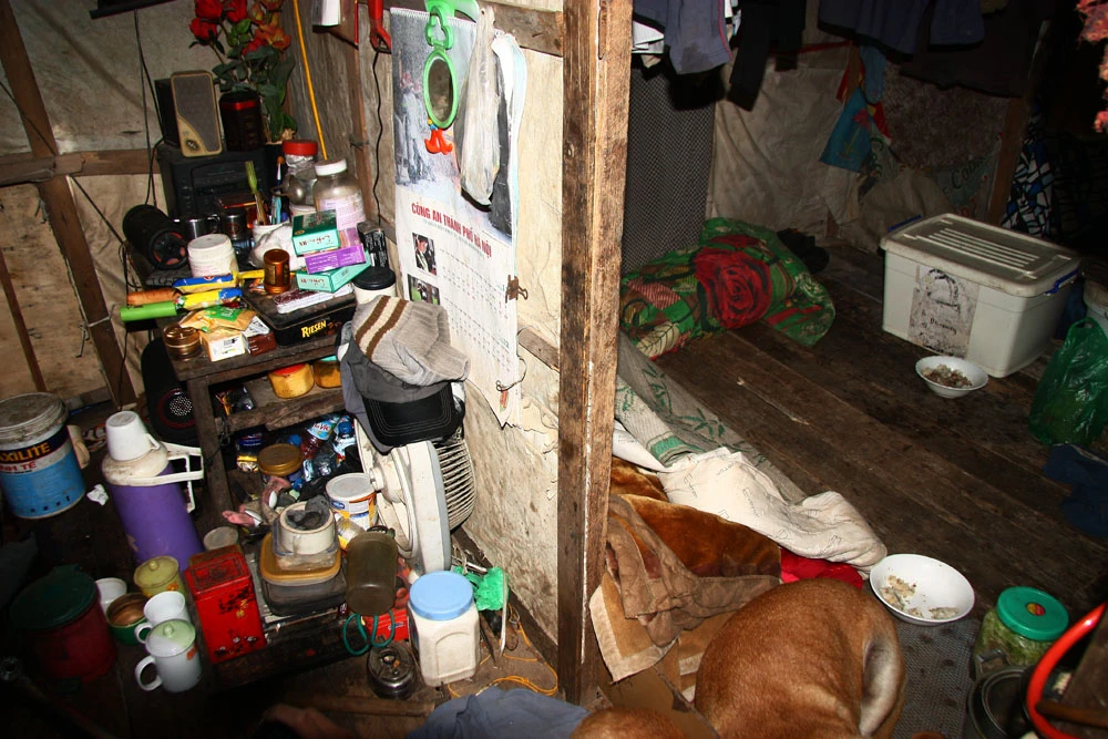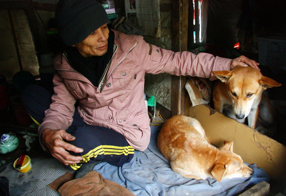 Trong túp lều nhỏ không quá 7 m2 dưới sông Hồng chỉ biết làm bạn với hai mẹ con chú chó Vàng, ông âu yếm vuốt ve, nói chuyện với chúng như những đứa con của mình.