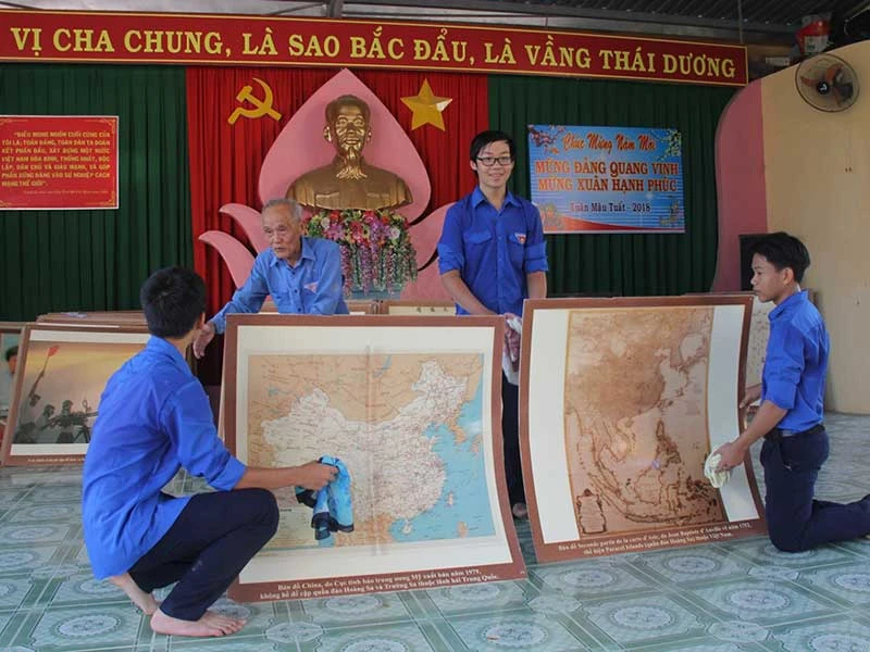 Tại đây, các bạn đoàn viên, thanh niên đã sắp xếp lại những tấm bản đồ, tư liệu khẳng định Hoàng Sa và Trường Sa là chủ quyền của Việt Nam từ thời nhà Nguyễn, những tài liệu thời Pháp thuộc, những tấm ảnh do Mỹ vẽ, chụp và ghi nhận…