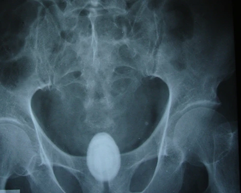 Sau khi chụp phim X- quang, siêu âm các bác sĩ phát hiện ra viên sỏi lớn nằm trong bàng quang bệnh nhân.