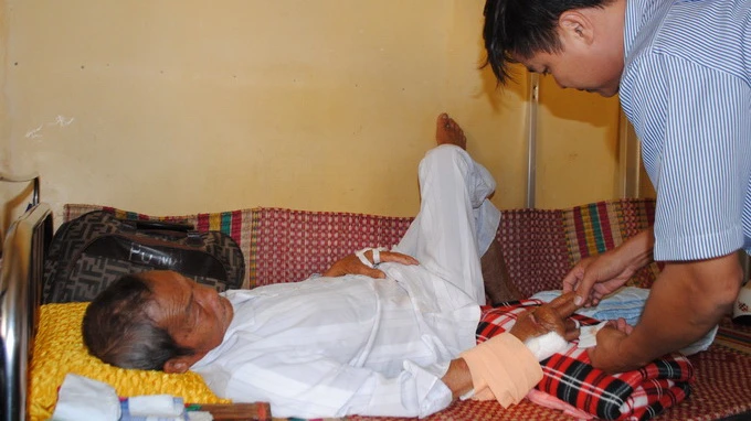 Bệnh viện cho biết cụ Lẫm bị gãy xương bàn tay (lóng thứ 4). Hai tay cụ Lẫm vẫn còn bầm tím, các ngón tay sưng phù.