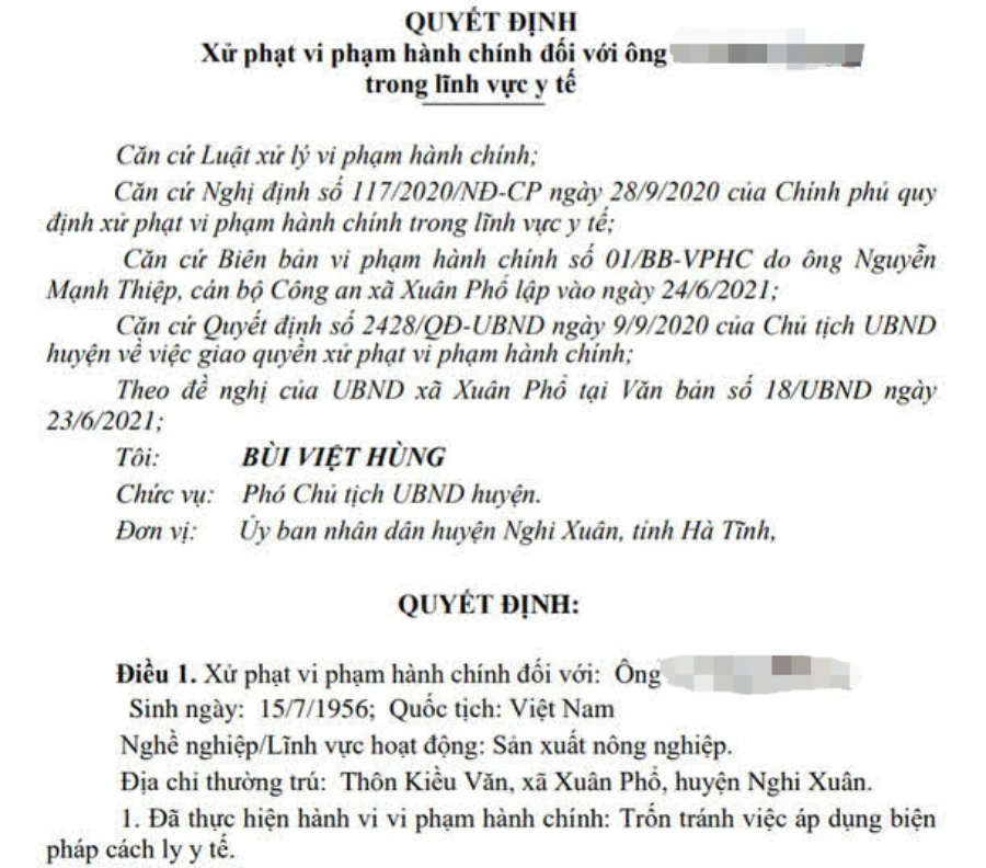 Trước đó, 28-6, ông Bùi Việt Hùng, Phó Chủ tịch UBND huyện Nghi Xuân ký quyết định xử phạt hành chính đối với ông K. (trú xã Xuân Phổ, huyện Nghi Xuân) trong lĩnh vực y tế.